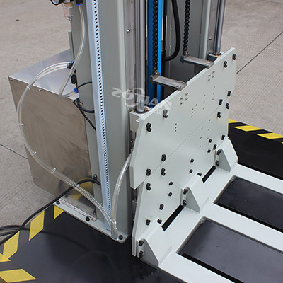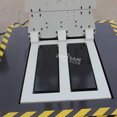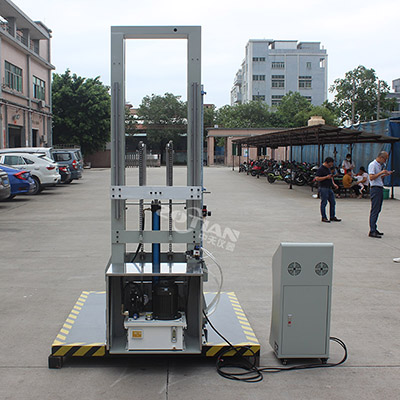 對(duì)于大型包裝貨物,一般質(zhì)量較大,在運(yùn)輸,搬運(yùn)時(shí)垂 直跌落的高度較低,因此,要求跌落試驗(yàn)臺(tái)的試驗(yàn)跌落高度也較低,零跌落試驗(yàn)機(jī)主要用于較大型包裝件作跌落試驗(yàn)。零跌落試驗(yàn)機(jī)由一個(gè)可以快速向下移動(dòng)的“E”型叉作為試件托架,被試貨物按試驗(yàn)要求(面,棱,角試驗(yàn))放置平衡。試驗(yàn)時(shí),托板高速向下運(yùn)動(dòng),脫離試件,“E”型叉在被試包裝貨物跌落至底板前,已在效率減振器的作用下,嵌平于底板,從理論上,零跌落試驗(yàn)機(jī)可從零高度至大跌落高度范圍作跌落試驗(yàn)。